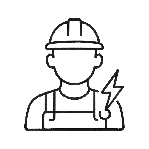 • Outline of a construction worker wearing a helmet and safety vest, holding a lightning bolt.