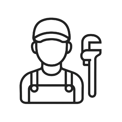 • Line drawing of a worker wearing a cap and overalls, holding a wrench.